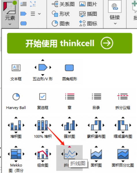 1、通过折线图可以显示数据随时间的变化趋势,打开PowerPoint软件,点击工具栏中的【插入】选项卡,在面板中找到think-cell中的【元素】按钮,在下拉菜单中有多种图表类型,在这里我们选择插入【折线图】模板。
