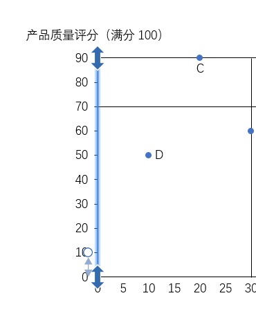 4、根据表格中的市场份额数据和产品质量评分我们可以计算出X轴和Y轴分别对应的平均值,在这里将其作为四象限图的划分点。其中市场份额的平均值为 (60+30+20+10)/4=120/4=30,产品质量评分的平均值为(80+60+90+50)/4=280/4=70,所以象限图的划分点为(30,70),在象限图中添加刻度线,然后保留划分线,手动将其他多余的刻度线删除。